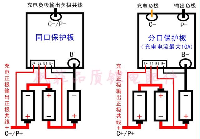 分口与同口保护板保护板为了现实保护电池的功能,必须要能够主动切断电池主回路。因此,在电池包内部,电池的主回路是要经过保护板的。为了对充电和放电都能进行控制,保护板必须具有两个开关,分别控制充电和放电回路(姑且这么理解)。在同口保护板中,这两个开关串在一条线上,接到电池包外部,充电和放电都经过此线。而在分口保护板中,电池分出两根线,分别接充电开关和放电开关,再接到电池外部。